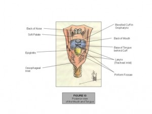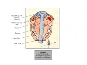 - It should be appreciated that the design of Tulip is based upon the principle of the air-tight oropharyngeal seal. This air, blood and secretion-tight seal allows the device to generate manual ventilating pressure and confidently protect the laryngeal inlet from descending blood and secretions with a blood and secretion-tight seal above the level of the cords, but below the impending surgery. This then enables the Tulip to be used instead of Endotracheal intubation and throat packs, as the glottic protection is afforded by the large balloon-cuff that generates an air, blood and secretion-tight seal above the level of the laryngeal inlet, keeping it safe from descending blood and secretions from the surgery that is occurring above the Tulip’s air-tight cuff.