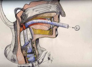 - Insert the Tulip into the mouth by sliding the tip against and along the hard palate. This allows the Tulip’s tip to be guided by the hard and soft palates into the oropharynx and pass behind the tip of the epiglottis.